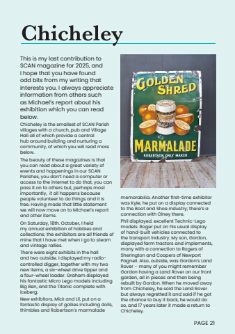 PAGE 21This is my last contribution to SCAN magazine for 2025, and I hope that you have found odd bits from my writing that interests you. I always appreciate information from others such as Michael%u2019s report about his exhibition which you can read below.Chicheley is the smallest of SCAN Parish villages with a church, pub and Village Hall all of which provide a central hub around building and nurturing a community, of which you will read more below. The beauty of these magazines is that you can read about a great variety of events and happenings in our SCAN Parishes, you don%u2019t need a computer or access to the internet to do that, you can pass it on to others but, perhaps most importantly, it all happens because people volunteer to do things and it is free. Having made that little statement we will now move on to Michael%u2019s report and other items.On Saturday, 18th. October, I held my annual exhibition of hobbies and collections; the exhibitors are all friends of mine that I have met when I go to steam and vintage rallies. There were eight exhibits in the hall and two outside. I displayed my radiocontrolled digger, together with my two new items, a six-wheel drive tipper and a four-wheel loader. Graham displayed his fantastic Micro Lego models including Big Ben, and the Titanic complete with iceberg.New exhibitors, Mick and Lil, put on a fantastic display of gollies including dolls, thimbles and Robertson%u2019s marmalade memorabilia. Another first-time exhibitor was Kyle; he put on a display connected to the Boot and Shoe industry; there%u2019s a connection with Olney there.Phil displayed. excellent Technic-Lego models. Roger put on his usual display of hand-built vehicles connected to the transport industry. My son, Gordon, displayed farm tractors and implements, many with a connection to Rogers of Sherington and Coopers of Newport Pagnell. Also, outside, was Gordon%u2019s Land Rover %u2013 many of you might remember Gordon having a Land Rover on our front garden, all in pieces and then being rebuilt by Gordon. When he moved away from Chicheley, he sold the Land Rover but always regretted it and said if he got the chance to buy it back, he would do so, and 17 years later it made a return to Chicheley.PAGE 21