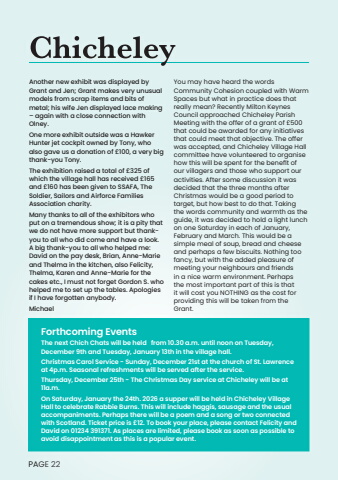 PAGE 22Another new exhibit was displayed by Grant and Jen; Grant makes very unusual models from scrap items and bits of metal; his wife Jen displayed lace making %u2013 again with a close connection with Olney.One more exhibit outside was a Hawker Hunter jet cockpit owned by Tony, who also gave us a donation of %u00a3100, a very big thank-you Tony.The exhibition raised a total of %u00a3325 of which the village hall has received %u00a3165 and %u00a3160 has been given to SSAFA, The Soldier, Sailors and Airforce Families Association charity.Many thanks to all of the exhibitors who put on a tremendous show; it is a pity that we do not have more support but thankyou to all who did come and have a look. A big thank-you to all who helped me: David on the pay desk, Brian, Anne-Marie and Thelma in the kitchen, also Felicity, Thelma, Karen and Anne-Marie for the cakes etc., I must not forget Gordon S. who helped me to set up the tables. Apologies if I have forgotten anybody.MichaelYou may have heard the words Community Cohesion coupled with Warm Spaces but what in practice does that really mean? Recently Milton Keynes Council approached Chicheley Parish Meeting with the offer of a grant of %u00a3500 that could be awarded for any initiatives that could meet that objective. The offer was accepted, and Chicheley Village Hall committee have volunteered to organise how this will be spent for the benefit of our villagers and those who support our activities. After some discussion it was decided that the three months after Christmas would be a good period to target, but how best to do that. Taking the words community and warmth as the guide, it was decided to hold a light lunch on one Saturday in each of January, February and March. This would be a simple meal of soup, bread and cheese and perhaps a few biscuits. Nothing too fancy, but with the added pleasure of meeting your neighbours and friends in a nice warm environment. Perhaps the most important part of this is that it will cost you NOTHING as the cost for providing this will be taken from the Grant. Forthcoming EventsThe next Chich Chats will be held from 10.30 a.m. until noon on Tuesday, December 9th and Tuesday, January 13th in the village hall.Christmas Carol Service - Sunday, December 21st at the church of St. Lawrence at 4p.m. Seasonal refreshments will be served after the service.Thursday, December 25th - The Christmas Day service at Chicheley will be at 11a.m. On Saturday, January the 24th. 2026 a supper will be held in Chicheley Village Hall to celebrate Rabbie Burns. This will include haggis, sausage and the usual accompaniments. Perhaps there will be a poem and a song or two connected with Scotland. Ticket price is %u00a312. To book your place, please contact Felicity and David on 01234 391371. As places are limited, please book as soon as possible to avoid disappointment as this is a popular event.