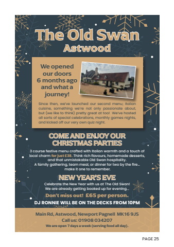 PAGE 25Main Rd, Astwood, Newport Pagnell MK16 9JSCall us: 01908 034207COME AND ENJOY OUR CHRISTMAS PARTIES%u00a03 course festive menu crafted with Italian warmth and a touch of local charm for just %u00a338. Think rich flavours, homemade desserts, and that unmistakable Old Swan hospitality.A family gathering, team meal, or dinner for two by the fire%u2026 make it one to remember.NEW YEAR%u2019S EVECelebrate the New Year with us at The Old Swan!We are open 7 days a week (serving food all day).The Old SwanAstwoodWe opened our doors6 months agoand what a journey!%u00a0Since then, we%u2019ve launched our second menu; Italian cuisine, something we%u2019re not only passionate about,but (we like to think) pretty great at too! We%u2019ve hosted all sorts of special celebrations, monthly games nights, and kicked off our very own quiz night. We are already getting booked up for evening...Don%u2019t miss out! %u00a365 per person.DJ RONNIE WILL BE ON THE DECKS FROM 10PM
