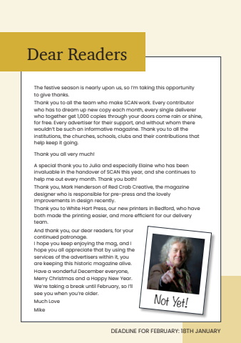 PAGE 3The festive season is nearly upon us, so I%u2019m taking this opportunity to give thanks.Thank you to all the team who make SCAN work. Every contributor who has to dream up new copy each month, every single deliverer who together get 1,000 copies through your doors come rain or shine, for free. Every advertiser for their support, and without whom there wouldn%u2019t be such an informative magazine. Thank you to all the institutions, the churches, schools, clubs and their contributions that help keep it going. Thank you all very much!A special thank you to Julia and especially Elaine who has been invaluable in the handover of SCAN this year, and she continues to help me out every month. Thank you both! Thank you, Mark Henderson of Red Crab Creative, the magazine designer who is responsible for pre-press and the lovely improvements in design recently. Thank you to White Hart Press, our new printers in Bedford, who have both made the printing easier, and more efficient for our delivery team. And thank you, our dear readers, for your continued patronage. I hope you keep enjoying the mag, and I hope you all appreciate that by using the services of the advertisers within it, you are keeping this historic magazine alive. Have a wonderful December everyone, Merry Christmas and a Happy New Year. We%u2019re taking a break until February, so I%u2019ll see you when you%u2019re older.Much LoveMike Dear ReadersDEADLINE FOR FEBRUARY: 18TH JANUARYNot Yet!