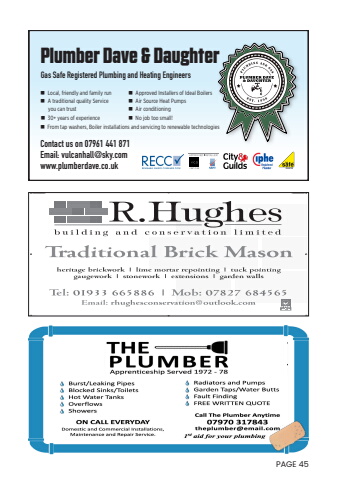 Gas Safe Registered Plumbing and Heating EngineersPlumber Dave & Daughter%uf06e Local, friendly and family run%uf06e A traditional quality Service you can trust%uf06e 30+ years of experience%uf06e Approved Installers of Ideal Boilers%uf06e Air Source Heat Pumps%uf06e Air conditioning%uf06e No job too small!Contact us on 07961 441 871 Email: vulcanhall@sky.com www.plumberdave.co.uk%uf06e From tap washers, Boiler installations and servicing to renewable technologiesPAGE 45