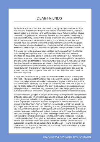 DEADLINE FOR DECEMBER: 18TH NOVEMBERDEAR FRIENDSBy the time you read this, the clocks will have gone back and we shall be well into the dark time of the year. But before November sets in, we have been treated to a glorious and uplifting tapestry of Autumn colour. I have been encouraged by the news that the new Archbishop of Canterbury is to be Sarah Mullaly, formally the bishop of London. She will be no stranger to the demands and expectations which come with that role, but she will also have to contend with extra pressures from some in the Anglican Communion, who can be less that charitable in their attitudes towards women in leadership. She will need our prayers to support and sustain her. This week, as I write, we have been uplifted by the ceasefire in the Middle East, seeing the captives from both sides reunited with their families and food and supplies going in to relieve the suffering in the Palestinian territories. However, only a day or two later there were reports of executions and shootings and threats of refusing further aid convoys. Who knows what the situation will be tomorrow, let alone in the future. We continue to pray. We can pray for the peacemakers, for the infinite wisdom and patience they need. But when it is unknown how such intractable problems can ever be solved, our very best prayer is %u201cYour Will be done%u201d. (NB. that%u2019s God%u2019s will be done not my will!) It happens that the reading from the New Testament set for Sunday the 19th Oct. %u2013 the day after this letter has to be with the Editor %u2013 is Jesus%u2019 story about the judge who was too idle and careless to give a widow the justice she deserved. In the story, she keeps on bothering him until, just to get rid of her, he finally acts on her behalf. The story is about prayer, encouraging us to be patient and persistent, not because God is like the judge in the story but because He will answer our prayers according to His timetable not ours.It is never easy to grapple in prayer over a huge world problem or a personal difficulty, especially when nothing seems to change, but we are encouraged not to give up or to feel that our problem is too small to bother God with or too big for Him to handle. It is said that prayer is always answered. The answer might be %u201cYes%u201d, %u201cNo%u201d or %u201cNot Yet%u201d. I would add to that %u2018Not exactly as you might want or expect.%u201c, but the thing is not to give up on telling God how you feel, what is troubling or hurting you, just as you might talk to a friend or relation. We need to be honest, patient and persistent. Prayer is much bigger than just asking for things. It is about building a relationship with God, not just talking to Him but listening to Him too, learning to recognise His voice. How do you do that? Through the centuries many ways have been tried and tested. We are all different and we all build relationships differently. One suggestion would be to go outside for a bit of a walk %u2013 round the garden or park would do. Breathe in the fresh air and thank God for whatever you see or hear which lifts your spirits.