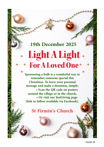 Light A LightFor A Loved OneSponsoring a bulb is a wonderful way to remember someone special this Christmas. To leave your personal message and make a donation, simply: %u2022 Scan the QR code on posters around the village or in the church, %u2022 Or visit our JustGiving page (link to follow available via Facebook).St Firmin's Church19th December 2025PAGE 15