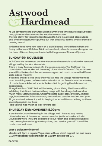 PAGE 16 As we say farewell to our Great British Summer it%u2019s time now to dig out those hats, gloves and scarves as the weather turns cooler.There is plenty for you all to look forward to here in Astwood. Step outside and smell the log burners puffing out that beautiful, earthy, smoky aroma of burning wood.Whist the trees have now taken on a quiet beauty. Very different from the flashy brilliance of October. Brick red, mustard yellow, bronze and copper are the hues of November punctuated with the greens of Pine and Spruce.SUNDAY 9th NOVEMBERAt 11.00am We remember our War Heroes and assemble outside the Astwood Village Hall by the War Memorials.This is a busy Sunday indeed. On the green opposite The Old Swan the monthly Farmers Market will be taking place from 10.00am- 2.00pm. Where you will find bakers butchers cheesemongers and much more with different stalls added monthly.If you find this all a little chilly then you will find the village hall as warm as toast. Providing teas, coffees and a selection of our finest homemade cakes, all made by our Astwood special bakers. Not forgetting the delicious hot bacon baps.Alongside this a CRAFT FAIR will be taking place. Living The Dream will be exhibiting their finest Italian clothing range with handbags, belts and so much more. Soft furnishings, Christmas gifts, sweet stall, jewellery, knitted toys, hand-made Christmas cards, decorations, candles and Mr. Art Cycle.All guaranteed to tempt you into buying that extra little something for those special people in our lives.I told you we had much to look forward too!THURSDAY 13th NOVEMBER 8.00pmIs our Parish Council meeting in the Village Hall. I have to say, having attended a few of these now. I am amazed at just how hard our Parish Councillors work. They are dedicated to our Parish and deal with subjects I had never given a thought to Pop along and see for yourself. You will be made most welcome.Just a quick reminder of:Mondays 6-7pm a regular Yoga class with Jo, which is great fun and costs %u00a37.00 Wednesday Walkers meet at 9.00am outside the V.H.