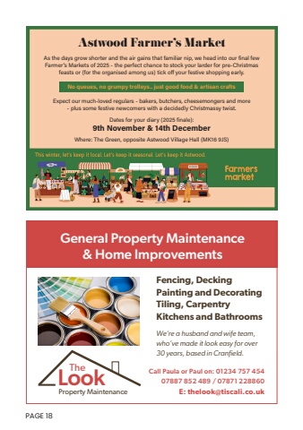 PAGE 18 Call Paula or Paul on: 01234 757 45407887 852 489 / 07871 228860E: thelook@tiscali.co.ukTheProperty MaintenanceLookFencing, DeckingPainting and DecoratingTiling, CarpentryKitchens and BathroomsGeneral Property Maintenance& Home ImprovementsWe%u2019re a husband and wife team, who%u2019ve made it look easy for over 30 years, based in Cranfield.Astwood Farmer%u2019s MarketAs the days grow shorter and the air gains that familiar nip, we head into our final few Farmer%u2019s Markets of 2025 - the perfect chance to stock your larder for pre-Christmas feasts or (for the organised among us) tick off your festive shopping early.Expect our much-loved regulars - bakers, butchers, cheesemongers and more - plus some festive newcomers with a decidedly Christmassy twist.Dates for your diary (2025 finale):9th November & 14th DecemberWhere: The Green, opposite Astwood Village Hall (MK16 9JS)No queues, no grumpy trolleys.. just good food & artisan crafts