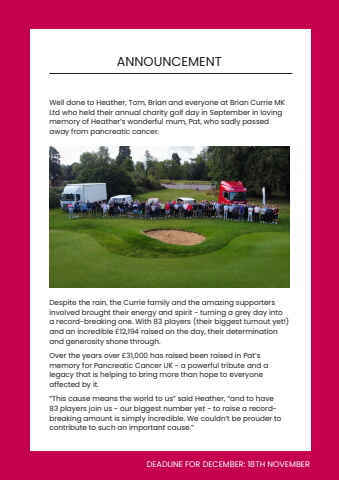 PAGE 19DEAR FRIENDS ANNOUNCEMENTDEADLINE FOR DECEMBER: 18TH NOVEMBERWell done to Heather, Tom, Brian and everyone at Brian Currie MK Ltd who held their annual charity golf day in September in loving memory of Heather%u2019s wonderful mum, Pat, who sadly passed away from pancreatic cancer.Despite the rain, the Currie family and the amazing supporters involved brought their energy and spirit - turning a grey day into a record-breaking one. With 83 players (their biggest turnout yet!) and an incredible %u00a312,194 raised on the day, their determination and generosity shone through.Over the years over %u00a331,000 has raised been raised in Pat%u2019s memory for Pancreatic Cancer UK - a powerful tribute and a legacy that is helping to bring more than hope to everyone affected by it. %u201cThis cause means the world to us%u201d said Heather, %u201cand to have 83 players join us - our biggest number yet - to raise a recordbreaking amount is simply incredible. We couldn%u2019t be prouder tocontribute to such an important cause.%u201d