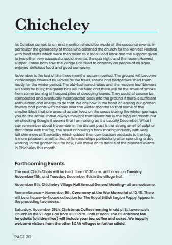PAGE 20 As October comes to an end, mention should be made of the seasonal events, in particular the generosity of those who adorned the church for the Harvest Festival with food stuffs which were then taken to a local Food Bank and the support given to two other very successful social events, the quiz night and the recent Harvest supper. These both saw the Village Hall filled to capacity as people of all ages enjoyed delicious food and good company.November is the last of the three months autumn period. The ground will become increasingly covered by leaves as the trees, shrubs and hedgerows shed them ready for the winter period. The old-fashioned rakes and the modern leaf blowers will soon be busy; the green bins will be filled and there will be the smell of smoke from some burning of heaped piles of decaying leaves. They could of course be composted and eventually Incorporated back into the ground if there is sufficient enthusiasm and energy to do that. We are now in the habit of leaving our garden flowers and plants with berries over the winter months so that some of the smaller birds that are around us can feed on the seeds during the winter, perhaps you do the same. I have always thought that November is the foggiest month but on checking Google it seems that I am wrong as it is usually December. What I can remember about November in the distant past is the strong smell of sulphur that came with the fog, the result of having a brick making industry with very tall chimneys at Stewartby which added their combustion products to the fog. A more pleasant smell is that of fish and chips particularly after spending a day working in the garden but for now, I will move on to details of the planned events in Chicheley this month.Forthcoming EventsThe next Chich Chats will be held from 10.30 a.m. until noon on Tuesday November 11th. and Tuesday, December 9th.in the village hall.November 5th. Chicheley Village Hall Annual General Meeting- all are welcome.Remembrance %u2013 November 9th. Ceremony at the War Memorial at 10.45. There will be a house-to-house collection for The Royal British Legion Poppy Appeal in the preceding two weeks.Saturday, November 29th. Christmas Coffee morning in aid of St. Lawrence%u2019s Church in the Village Hall from 10.30 a.m. until 12 noon. The %u00a35 entrance fee for adults (children free) will include your tea, coffee and cakes. We happily welcome visitors from the other SCAN villages or further afield.