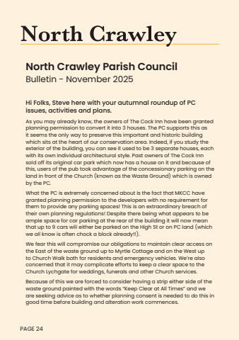 PAGE 24Hi Folks, Steve here with your autumnal roundup of PC issues, activities and plans. As you may already know, the owners of The Cock Inn have been granted planning permission to convert it into 3 houses. The PC supports this as it seems the only way to preserve this important and historic building which sits at the heart of our conservation area. Indeed, if you study the exterior of the building, you can see it used to be 3 separate houses, each with its own individual architectural style. Past owners of The Cock Inn sold off its original car park which now has a house on it and because of this, users of the pub took advantage of the concessionary parking on the land in front of the Church (known as the Waste Ground) which is owned by the PC. What the PC is extremely concerned about is the fact that MKCC have granted planning permission to the developers with no requirement for them to provide any parking spaces! This is an extraordinary breach of their own planning regulations! Despite there being what appears to be ample space for car parking at the rear of the building it will now mean that up to 9 cars will either be parked on the High St or on PC land (which we all know is often chock a block already!!). We fear this will compromise our obligations to maintain clear access on the East of the waste ground up to Myrtle Cottage and on the West up to Church Walk both for residents and emergency vehicles. We%u2019re also concerned that it may complicate efforts to keep a clear space to the Church Lychgate for weddings, funerals and other Church services. Because of this we are forced to consider having a strip either side of the waste ground painted with the words %u201cKeep Clear at All Times%u201d and we are seeking advice as to whether planning consent is needed to do this in good time before building and alteration work commences.North Crawley Parish CouncilBulletin - November 2025
