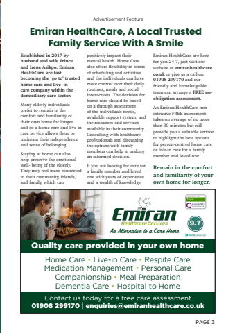 PAGE 3Established in 2017 by husband and wife Prince and Irene Asikpo, Emiran HealthCare are fast becoming the %u2018go to%u2019 trusted home care and livein care company within the domicilliary care sector.Many elderly individuals prefer to remain in the comfort and familiarity of their own home for longer, and so a home care and live-in care service allows them to maintain their independence and sense of belonging.Staying at home can also help preserve the emotional wellbeing of the elderly. They may feel more connected to their community, friends, and family, which can positively impact their mental health. Home Care also offers flexibility in terms of scheduling and activities and the individuals can have more control over their daily routines, meals and social interactions. The decision for home care should be based on a through assessment of the individuals needs, available support system, and the resources and services available in their community.Consulting with healthcare professionals and discussing the options with family members can help in making an informed decision.If you are looking for care for a family member and loved one with years of experience and a wealth of knowledge Emiran HealthCare are here for you 24-7, just visit our website at emiranhealthcare.co.ukor give us a call on 01908 299170 and our friendly and knowledgable team can arrange a FREE no-obligation assessment.An Emiran HealthCare nonintrusive FREE assessment takes on average of no more than 30 minutes but will provide you a valuable service to highlight the best options for person-centred home care or live-in care for a family member and loved one.Emiran HealthCare, A Local Trusted Family Service With A SmileRemain in thecomfort and familiarity of your own homefor longer9.7Quality care provided in your own homeHome Care %u2022 Live-in Care %u2022 Respite CareMedication Management %u2022 Personal CareCompanionship %u2022 Meal PreparationDementia Care %u2022 Hospital to HomeContact us today for a free care assessment01908 299170 | enquiries@emiranhealthcare.co.ukAn Alternative to a Care Home A guide for registered providers on using CQC%u2019s promotional graphics The promotional graphicsWe have produced artwork for different requirements.For providers or services rated good or outstanding:And for all registered providers (choice of either purple or white background):Established in 2017 by husband and wife Prince and Irene Asikpo, Emiran HealthCare are fast becoming the %u2018go to%u2019 trusted home care and live- in care company within the domicilliary care sector. Many elderly individuals prefer to remain in the comfort and familiarity of their own home for longer, and so a home care and live-in care service allows them to maintain their independence and sense of belonging.Staying at home can also help preserve the emotional well- being of the elderly. They may feel more connected to their community, friends, and family, which can positively impact their mental health. Home Care also offers flexibility in terms of scheduling and activities and the individuals can have more control over their daily routines, meals and social interactions. The decision for home care should be based on a through assessment of the individuals needs, available support system, and the resources and services available in their community. Consulting with healthcare professionals and discussing the options with family members can help in making an informed decision.If you are looking for care for a family member and loved one with years of experience and a wealth of knowledge Emiran HealthCare are here for you 24-7, just visit our website at emiranhealthcare.co.uk or give us a call on 01908 299170 and our friendly and knowledgable team can arrange a FREE noobligation assessment.An Emiran HealthCare nonintrusive FREE assessment takes on average of no more than 30 minutes but will provide you a valuable service to highlight the best options for person-centred home care or live-in care for a family member and loved one.Remain in the comfort and familiarity of your own home for longer.Emiran HealthCare, A Local Trusted Family Service With A SmileAdvertisement Feature
