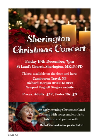 PAGE 30 SheringtonChristmas ConcertFriday 19th December, 7pmSt Laud%u2019s Church, Sherington, MK16 9PDTickets available on the door and here:Cambourne Travel, NPRichard Morgan 01908 611389Newport Pagnell Singers websitePrices: Adults: %u00a312; Under 16s: %u00a35An early evening Christmas Carol Concert with songs and carols to listen to and join in with.Mulled wine and mince pies included!