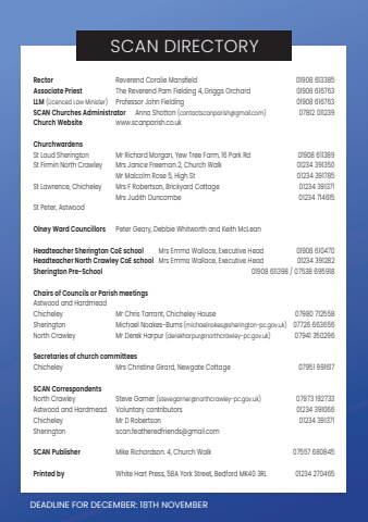 SCAN DIRECTORYRector Reverend Coralie Mansfield 01908 613385Associate Priest The Reverend Pam Fielding 4, Griggs Orchard 01908 616763LLM (Licenced Law Minister) Professor John Fielding 01908 616763SCAN Churches Administrator Anna Shotton (contactscanparish@gmail.com) 07812 011239Church Website www.scanparish.co.ukChurchwardensSt Laud Sherington Mr Richard Morgan, Yew Tree Farm, 16 Park Rd 01908 611389St Firmin North Crawley Mrs Janice Freeman 2, Church Walk 01234 391350Mr Malcolm Rose 5, High St 01234 391785St Lawrence, Chicheley Mrs F Robertson, Brickyard Cottage 01234 391371Mrs Judith Duncombe 01234 714615St Peter, Astwood Olney Ward Councillors Peter Geary, Debbie Whitworth and Keith McLeanHeadteacher Sherington CoE school Mrs Emma Wallace, Executive Head 01908 610470Headteacher North Crawley CoE school Mrs Emma Wallace, Executive Head 01234 391282Sherington Pre-School 01908 611398 / 07538 695918Chairs of Councils or Parish meetingsAstwood and Hardmead Chicheley Mr Chris Tarrant, Chicheley House 07980 712558Sherington Michael Noakes-Burns (michaelnokes@sherington-pc.gov.uk) 07726 663656North Crawley Mr Derek Harpur (derekharpur@northcrawley-pc.gov.uk) 07941 350296Secretaries of church committeesChicheley Mrs Christine Girard, Newgate Cottage 07951 991617SCAN Correspondents North Crawley Steve Garner (stevegarner@northcrawley-pc.gov.uk) 07973 192733Astwood and Hardmead Voluntary contributors 01234 391066Chicheley Mr D Robertson 01234 391371Sherington scan.featheredfriends@gmail.comSCAN Publisher Mike Richardson. 4, Church Walk 07557 680845Printed by White Hart Press, 58A York Street, Bedford MK40 3RL 01234 270465DEADLINE FOR DECEMBER: 18TH NOVEMBER