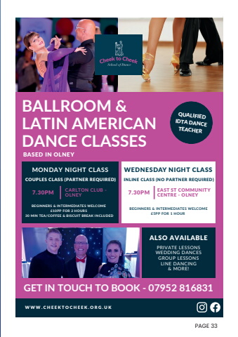 PAGE 33COUPLES CLASS (PARTNER REQUIRED) INLINE CLASS (NO PARTNER REQUIRED)BALLROOM &LATIN AMERICANDANCE CLASSESWWW.CHEEKTOCHEEK.ORG.UKALSO AVAILABLE QUALIFIED IDTA DANCE TEACHERPRIVATE LESSONSWEDDING DANCESGROUP LESSONSLINE DANCING& MORE!MONDAY NIGHT CLASSBEGINNERS & INTERMEDIATES WELCOME%u00a310PP FOR 2 HOURS30 MIN TEA/COFFEE & BISCUIT BREAK INCLUDEDWEDNESDAY NIGHT CLASSEAST ST COMMUNITYCENTRE - OLNEYBEGINNERS & INTERMEDIATES WELCOME%u00a35PP FOR 1 HOURBASED IN OLNEYGET IN TOUCH TO BOOK - 07952 8168317.30PM CARLTON CLUB -OLNEY 7.30PM