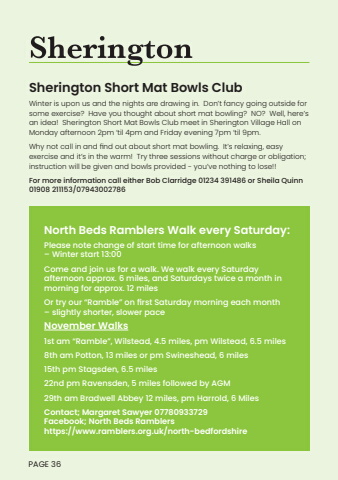 PAGE 34Sherington Short Mat Bowls ClubWinter is upon us and the nights are drawing in. Don%u2019t fancy going outside for some exercise? Have you thought about short mat bowling? NO? Well, here%u2019s an idea! Sherington Short Mat Bowls Club meet in Sherington Village Hall on Monday afternoon 2pm %u2018til 4pm and Friday evening 7pm %u2018til 9pm.Why not call in and find out about short mat bowling. It%u2019s relaxing, easy exercise and it%u2019s in the warm! Try three sessions without charge or obligation; instruction will be given and bowls provided - you%u2019ve nothing to lose!!For more information call either Bob Clarridge 01234 391486 or Sheila Quinn 01908 211153/07943002786North Beds Ramblers Walk every Saturday:Please note change of start time for afternoon walks %u2013 Winter start 13:00Come and join us for a walk. We walk every Saturday afternoon approx. 6 miles, and Saturdays twice a month in morning for approx. 12 milesOr try our %u201cRamble%u201d on first Saturday morning each month %u2013 slightly shorter, slower paceNovember Walks1st am %u201cRamble%u201d, Wilstead, 4.5 miles, pm Wilstead, 6.5 miles8th am Potton, 13 miles or pm Swineshead, 6 miles15th pm Stagsden, 6.5 miles22nd pm Ravensden, 5 miles followed by AGM29th am Bradwell Abbey 12 miles, pm Harrold, 6 MilesContact; Margaret Sawyer 07780933729 Facebook; North Beds Ramblershttps://www.ramblers.org.uk/north-bedfordshirePAGE 36