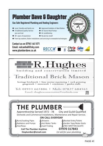Gas Safe Registered Plumbing and Heating EngineersPlumber Dave & Daughter%uf06e Local, friendly and family run%uf06e A traditional quality Service you can trust%uf06e 30+ years of experience%uf06e Approved Installers of Ideal Boilers%uf06e Air Source Heat Pumps%uf06e Air conditioning%uf06e No job too small!Contact us on 07961 441 871 Email: vulcanhall@sky.com www.plumberdave.co.uk%uf06e From tap washers, Boiler installations and servicing to renewable technologiesPAGE 41