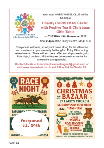 Everyone is welcome, so why not come along for the afternoon and maybe pick up some early festive gifts. Entry %u00a35 including refreshments. There will also be a raffle, and all proceeds go to Ride High, Loughton, Milton Keynes (an equestrian centre for vulnerable young people).Contact Jackie at innerwheelnewportpagnell@gmail.com or visit www.innerwheel.co.uk and follow link to District 26.Your local INNER WHEEL CLUB will be holding aCharity CHRISTMAS FAYRE with Festive Tea & Christmas Gifts Tableon TUESDAY 18th November 2025 from 2-4pm at the Olney Centre, MK46 5HRPAGE 44