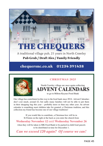Our village has contributed in this way to the food bank since 2014. Advent Calendars don%u2019t cost much, around %u00a32, but sadly many families will not be able to put them in their shopping bag this year %u2013 probably more so than any other year. An advent calendar is something most children take for granted, a Christmas tradition, and this collection my friend has become one of our village traditions!If you would like to contribute, a Christmas box will be in St Firmin on the right at the back as you enter the church fromWednesday November 12 until Wednesday November 26when they will be taken to MK Food Bank to be packed in child food parcels to be distributed in time for December 1.Can we exceed 120 again? Of course we can!CHRISTMAS 2025North Crawley village are once again collectingADVENT CALENDARSto go to Milton Keynes Food BankTHE CHEQUERSchequersnc.co.uk 01234 391438A traditional village pub, 21 years in North CrawleyPub Grub / Draft Ales / Family FriendlyPAGE 45