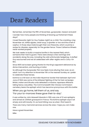 PAGE 5Remember, remember the fifth of November%u2026gunpowder, treason and plot!I wonder how many people are thinking of blowing up Parliament these days?I loved fireworks night (or Guy Fawkes night) as a child. The crackling, crisp November air, toffee apples, oxtail soup, a sparkler or two and the smell of sulphur. In those days Dads bought their own fireworks, which could be a recipe for disaster, especially for the garden fence. Those Catherine Wheels never worked properly.We took weeks to build a massive bonfire in the nearest field, which someone then had to guard. There were always a few warnings and accidents along the way, including the odd unfortunate hedgehog. A stuffed Guy was burned and we all celebrated with after-eights and a Carry-On film.Since 1605 we%u2019ve been giving thanks for the King%u2019s apparent deliverance by divine intervention, and burning a traitor. So although the Gunpowder Plot now feels more alluring than ever, as an adult I turn my attention to November 11th or the nearest Sunday as I prefer to celebrate these heroes. Kohima is a hill town on the India-Myanmar border that between April and June of 1944 saw some of the bitterest fighting of the Far East campaign. British, Indian and Ghurka units defeated a massive Japanese offensive taking heavy casualties. The Commonwealth War Graves Commission cemetery bears the epitaph which has become synonymous with this battle: When you go home, tell them of us, and say %u201cFor your to-morrows these gave their to-day%u201d.It was written by John Maxwell Edwards in 1919, was one of 12 war epitaphs and aimed at a British graveyard in France. The Kohima epitaph says it all simply and with brevity. It%u2019s as hard hitting now as when I first heard it.There are many memorial services across the area. I hope you can make one.Have a great November. Mike Dear ReadersDEADLINE FOR DECEMBER: 18TH NOVEMBER