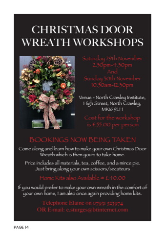 Saturday 29th November 2.30pm-4.30pmAndSunday 30th November 10.30am-12.30pmVenue - North Crawley Institute, High Street, North Crawley, MK16 9LHCost for the workshop is %u00a355.00 per personCHRISTMAS DOOR WREATH WORKSHOPSBOOKINGS NOW BEING TAKENCome along and learn how to make your own Christmas Door Wreath which is then yours to take home.Price includes all materials, tea, coffee, and a mince pie. Just bring along your own scissors/secateursHome Kits also Available @ %u00a340.00If you would prefer to make your own wreath in the comfort of your own home, I am also once again providing home kits. Telephone Elaine on 07931 523974 OR E-mail: e.sturges@btinternet.comPAGE 14