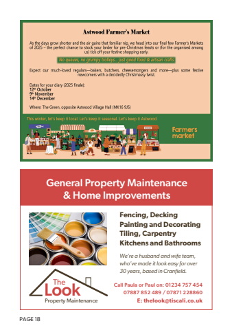 PAGE 18 Call Paula or Paul on: 01234 757 45407887 852 489 / 07871 228860E: thelook@tiscali.co.ukTheProperty MaintenanceLookFencing, DeckingPainting and DecoratingTiling, CarpentryKitchens and BathroomsGeneral Property Maintenance& Home ImprovementsWe%u2019re a husband and wife team, who%u2019ve made it look easy for over 30 years, based in Cranfield.