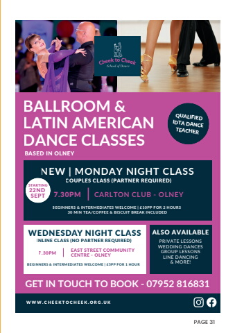 PAGE 31BALLROOM &LATIN AMERICANDANCE CLASSESWWW.CHEEKTOCHEEK.ORG.UKALSO AVAILABLEINLINE CLASS (NO PARTNER REQUIRED)QUALIFIED IDTA DANCE TEACHERPRIVATE LESSONSWEDDING DANCESGROUP LESSONSLINE DANCING& MORE!NEW | MONDAY NIGHT CLASSCOUPLES CLASS (PARTNER REQUIRED)BEGINNERS & INTERMEDIATES WELCOME | %u00a310PP FOR 2 HOURS30 MIN TEA/COFFEE & BISCUIT BREAK INCLUDEDWEDNESDAY NIGHT CLASSEAST STREET COMMUNITYCENTRE - OLNEYBEGINNERS & INTERMEDIATES WELCOME | %u00a35PP FOR 1 HOURBASED IN OLNEYGET IN TOUCH TO BOOK - 07952 8168317.30PM7.30PM CARLTON CLUB - OLNEYSTARTING22NDSEPT