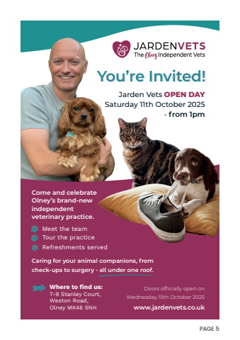 You%u2019re Invited!Jarden Vets OPEN DAYSaturday 11th October 2025- from 1pmCome and celebrateOlney%u2019s brand-new independent veterinary practice.Meet the teamTour the practiceRefreshments servedCaring for your animal companions, from check-ups to surgery - all under one roof.Where to find us:7-9 Stanley Court, Weston Road,Olney MK46 5NHDoors officially open onWednesday 15th October 2025www.jardenvets.co.ukPAGE 5