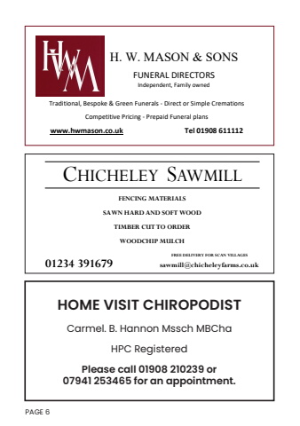 H. W. MASON & SONSFUNERAL DIRECTORSIndependent, Family ownedTraditional, Bespoke & Green Funerals - Direct or Simple CremationsCompetitive Pricing - Prepaid Funeral planswww.hwmason.co.uk Tel 01908 611112CHICHELEY SAWMILL 01234 391679 sawmill@chicheleyfarms.co.ukFENCING MATERIALSSAWN HARD AND SOFT WOODTIMBER CUT TO ORDERWOODCHIP MULCHFREE DELIVERY FOR SCAN VILLAGESHOME VISIT CHIROPODISTCarmel. B. Hannon Mssch MBChaHPC RegisteredPlease call 01908 210239 or 07941 253465 for an appointment.PAGE 6