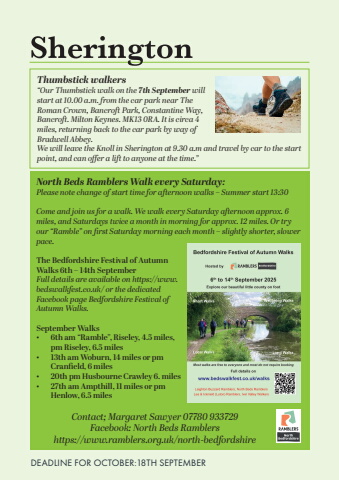 Thumbstick walkers%u201cOur Thumbstick walk on the 7th September will start at 10.00 a.m. from the car park near The Roman Crown, Bancrof Park, Constantine Way, Bancrof. Milton Keynes. MK13 0RA. It is circa 4 miles, returning back to the car park by way of Bradwell Abbey.We will leave the Knoll in Sherington at 9.30 a.m and travel by car to the start point, and can ofer a lif to anyone at the time.%u201dNorth Beds Ramblers Walk every Saturday:Please note change of start time for afernoon walks %u2013 Summer start 13:30Come and join us for a walk. We walk every Saturday afernoon approx. 6 miles, and Saturdays twice a month in morning for approx. 12 miles. Or try our %u201cRamble%u201d on frst Saturday morning each month %u2013 slightly shorter, slower pace. The Bedfordshire Festival of Autumn Walks 6th %u2013 14th SeptemberFull details are available on htps://www.bedswalkfest.co.uk/ or the dedicated Facebook page Bedfordshire Festival of Autumn Walks.September Walks%u2022 6th am %u201cRamble%u201d, Riseley, 4.5 miles, pm Riseley, 6.5 miles%u2022 13th am Woburn, 14 miles or pm Cranfeld, 6 miles%u2022 20th pm Husbourne Crawley 6. miles %u2022 27th am Ampthill, 11 miles or pm Henlow, 6.5 miles Contact; Margaret Sawyer 07780 933729 Facebook: North Beds Ramblershtps://www.ramblers.org.uk/north-bedfordshireDEADLINE FOR OCTOBER:18TH SEPTEMBER