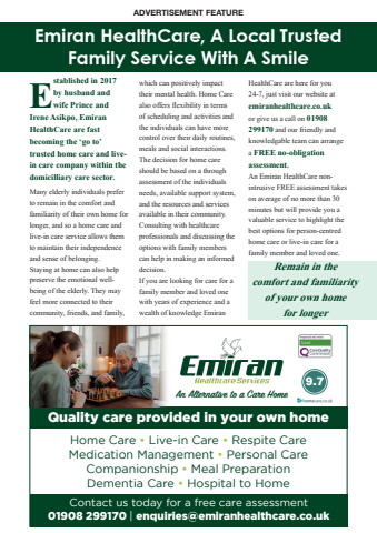 Established in 2017 by husband and wife Prince and Irene Asikpo, Emiran HealthCare are fast becoming the %u2018go to%u2019 trusted home care and livein care company within the domicilliary care sector.Many elderly individuals prefer to remain in the comfort and familiarity of their own home for longer, and so a home care and live-in care service allows them to maintain their independence and sense of belonging.Staying at home can also help preserve the emotional wellbeing of the elderly. They may feel more connected to their community, friends, and family, which can positively impact their mental health. Home Care also offers flexibility in terms of scheduling and activities and the individuals can have more control over their daily routines, meals and social interactions. The decision for home care should be based on a through assessment of the individuals needs, available support system, and the resources and services available in their community.Consulting with healthcare professionals and discussing the options with family members can help in making an informed decision.If you are looking for care for a family member and loved one with years of experience and a wealth of knowledge Emiran HealthCare are here for you 24-7, just visit our website at emiranhealthcare.co.ukor give us a call on 01908 299170 and our friendly and knowledgable team can arrange a FREE no-obligation assessment.An Emiran HealthCare nonintrusive FREE assessment takes on average of no more than 30 minutes but will provide you a valuable service to highlight the best options for person-centred home care or live-in care for a family member and loved one.Emiran HealthCare, A Local Trusted Family Service With A SmileADVERTISEMENT FEATURERemain in thecomfort and familiarity of your own homefor longer9.7Quality care provided in your own homeHome Care %u2022 Live-in Care %u2022 Respite CareMedication Management %u2022 Personal CareCompanionship %u2022 Meal PreparationDementia Care %u2022 Hospital to HomeContact us today for a free care assessment01908 299170 | enquiries@emiranhealthcare.co.ukAn Altenative to a Cae Hoe A guide for registered providers on using CQC%u2019s promotional graphicsThe promotional graphicsWe have produced artwork for different requirements.For providers or services rated good or outstanding:And for all registered providers (choice of either purple or white background):