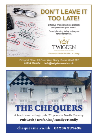 Please take a free blanketDON%u2019T LEAVE ITTOO LATE!Effective fnancial advice protects and preserves your wealth. Smart planning today helps your family tomorrow. Prospect Place, 23 Osier Way, Olney, Bucks MK46 5FP01234 270 074 info@twigdenasset.co.uk Financial advice for life - in Olney.THE CHEQUERSchequersnc.co.uk 01234 391438A traditional village pub, 21 years in North CrawleyPub Grub / Draft Ales / Family Friendly