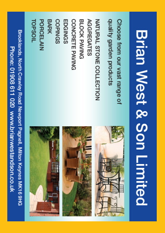 TOPSOIL PORCELAIN BARK COPINGS EDGINGS CONCRETE PAVING BLOCK PAVING AGGREGATES NATURAL STONE COLLECTION quality garden products Choose from our vast range of Brooklands, North Crawley Road Newport Pagnell, Milton Keynes MK16 9HG Brian West & Son Limited Phone: 01908 611 020 www.brianwestandson.co.uk