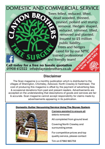 01908 612322 info@claytonbrothers.co.ukDomestic Gutter Vacuuming Service Using The Skyvac SystemCamera assisted to ensure alldebris removedAll completed from ground levelCovering North Crawley and surrounding areasFor competitive prices and top quality service, please contactTim on 07960 965759DisclaimerThe Scan magazine is a monthly publication which is distributed to the villages of Sherington, Chicheley, Astwood, North Crawley & Hardmead. The cost of producing this magazine is ofset by the payment of advertising fees & occasional donations from past and present readers. Advertisements are accepted on the understanding that descriptions of goods and services are fair & accurate. Scan magazine cannot accept responsibility for claims made by advertisements appearing in its publication.